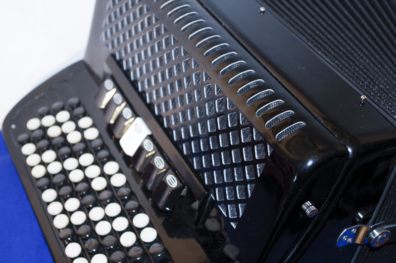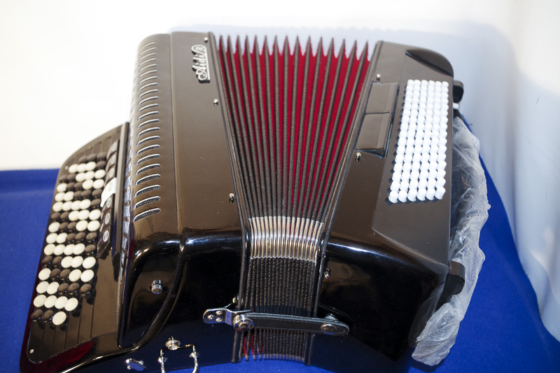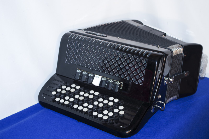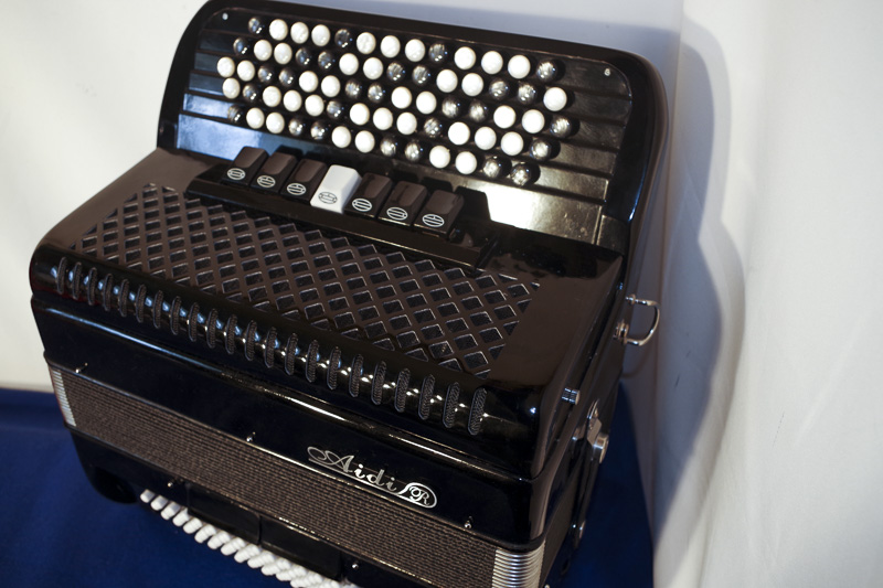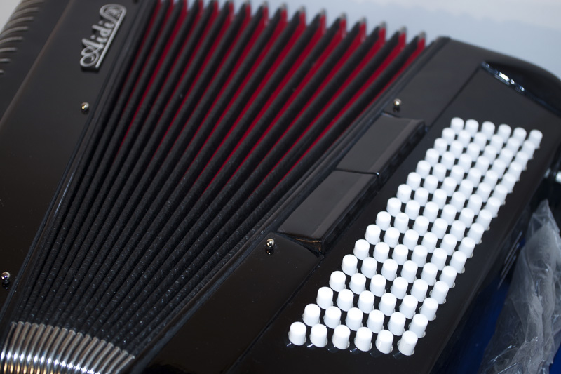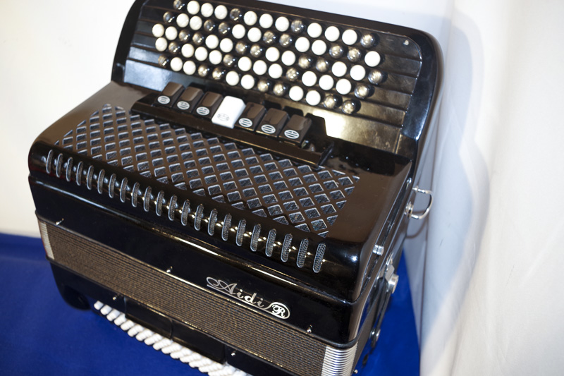 New Aidi accordion with 69 keys on the right hand (same note push and pull) in the B system preferred by classical musicians and 96 bass buttons. Supplied with plan of buttons to get you started right away. This is a very nice black finished accordion and absolutely brand new. There are 7 couplers on the right hand to give different tone choices (3 sets of reeds tuned LMM) and 2 bass couplers for different bass tones. Really nice black finish on this one. Even fitted with a backpad.