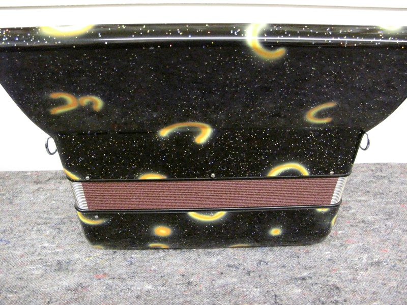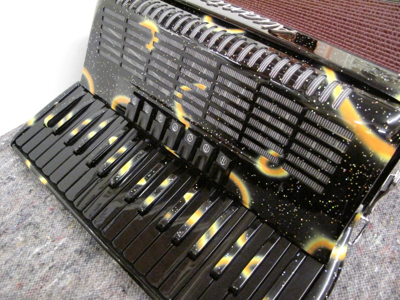 Incredible appearance and quality finish in black speckled glitter and art work in a compact 37 key model with 96 bass buttons.