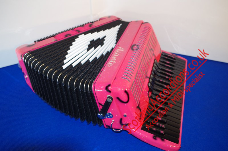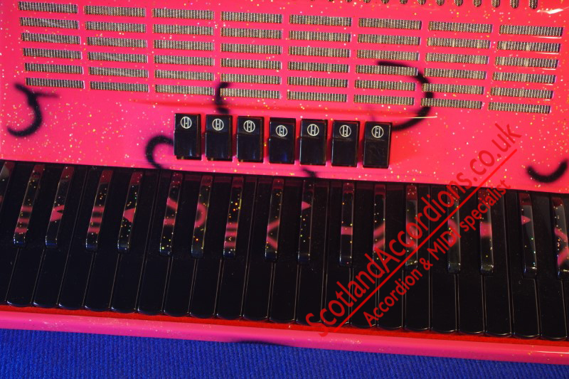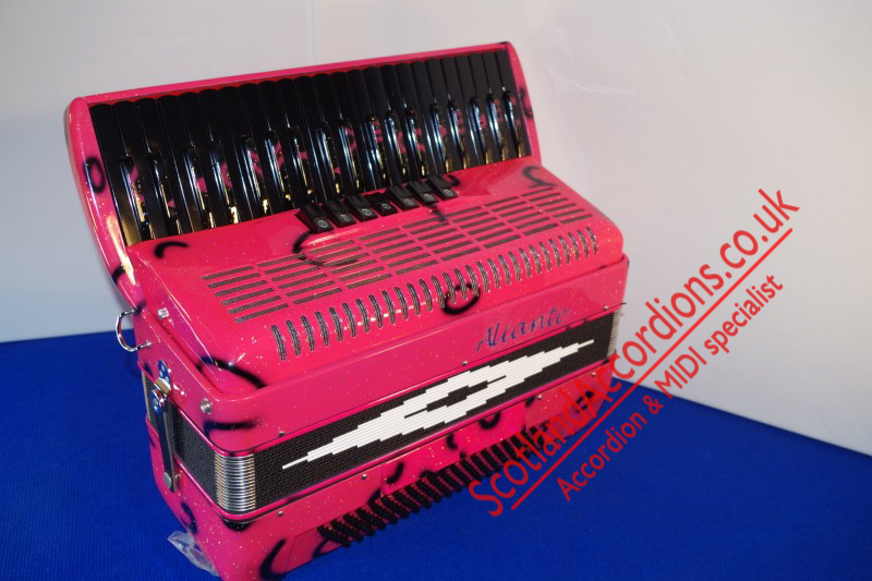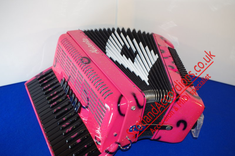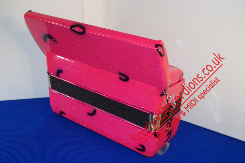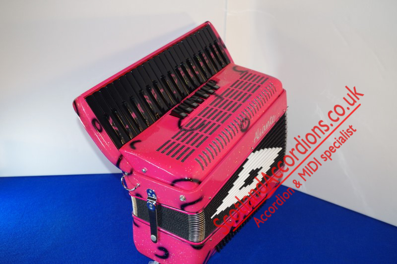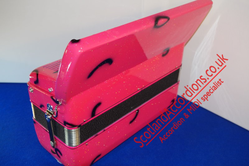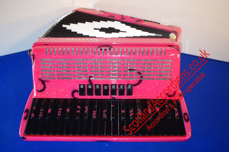 Incredible appearance and quality finish in pink with glitter and black keys and black art work in a compact 41 key model with 120 bass buttons.