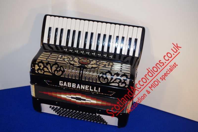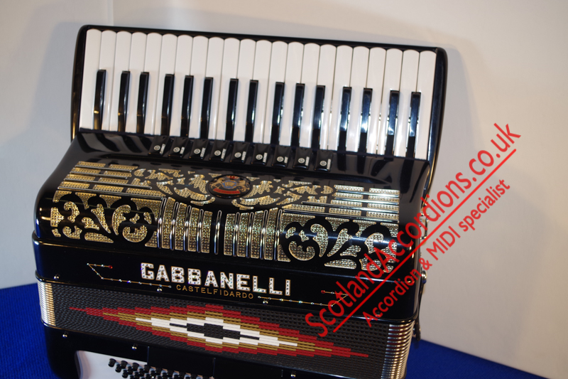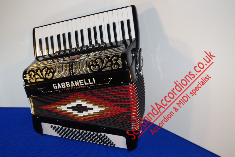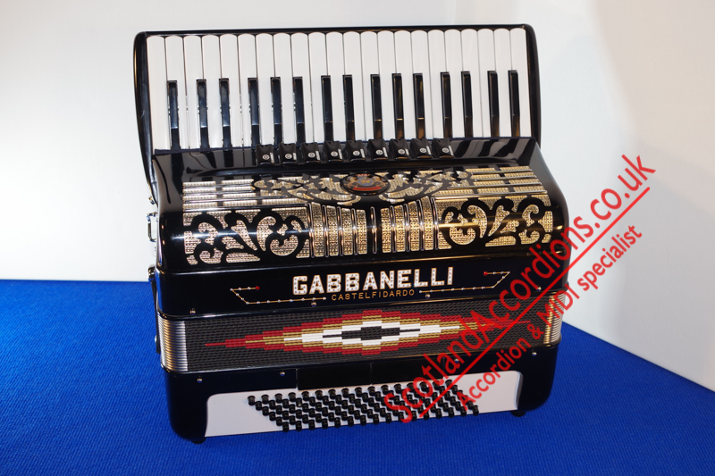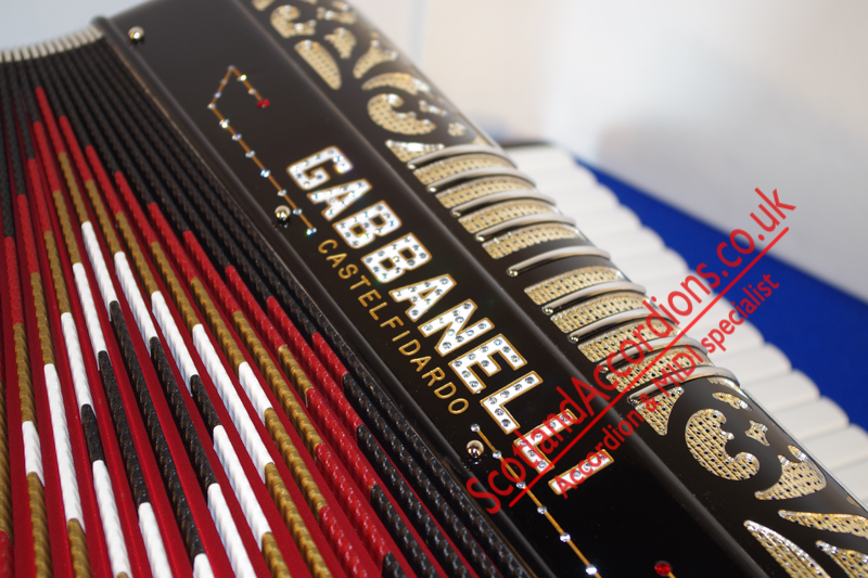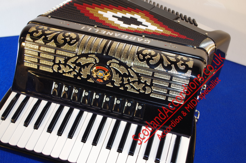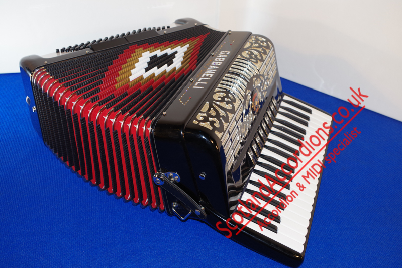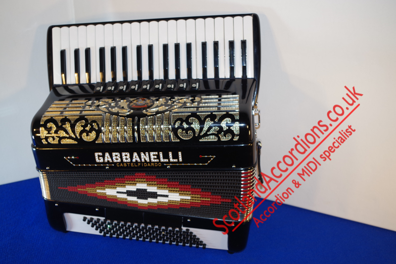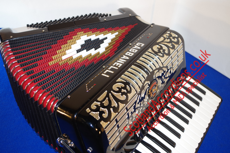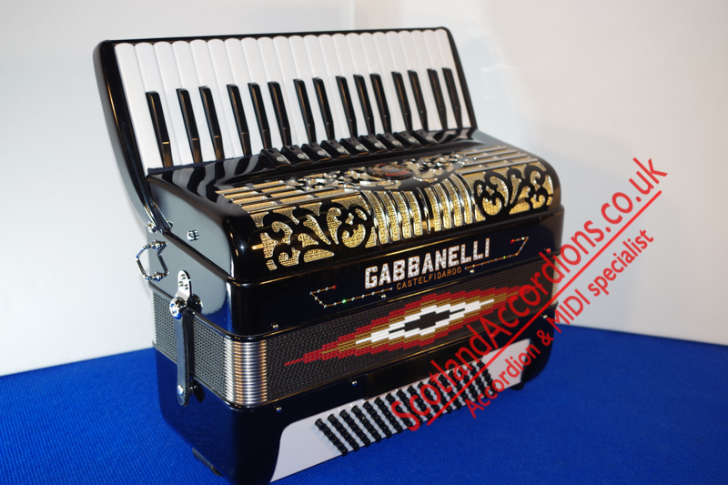 Scotlandaccordions are pleased to present Gabbanelli 37 key 96 bass accordion finished in black with dwcoration and deorated bellows.