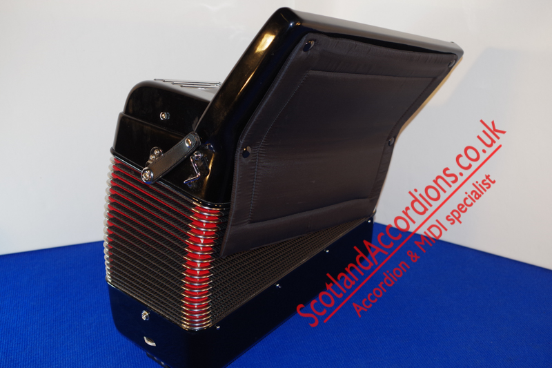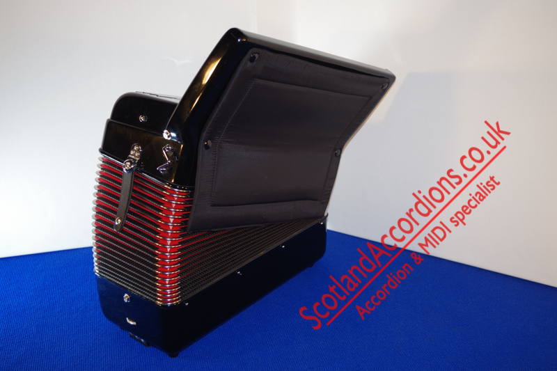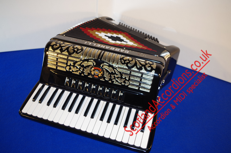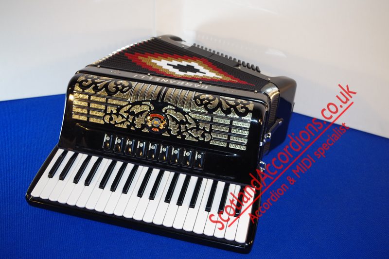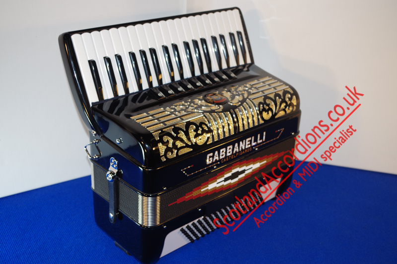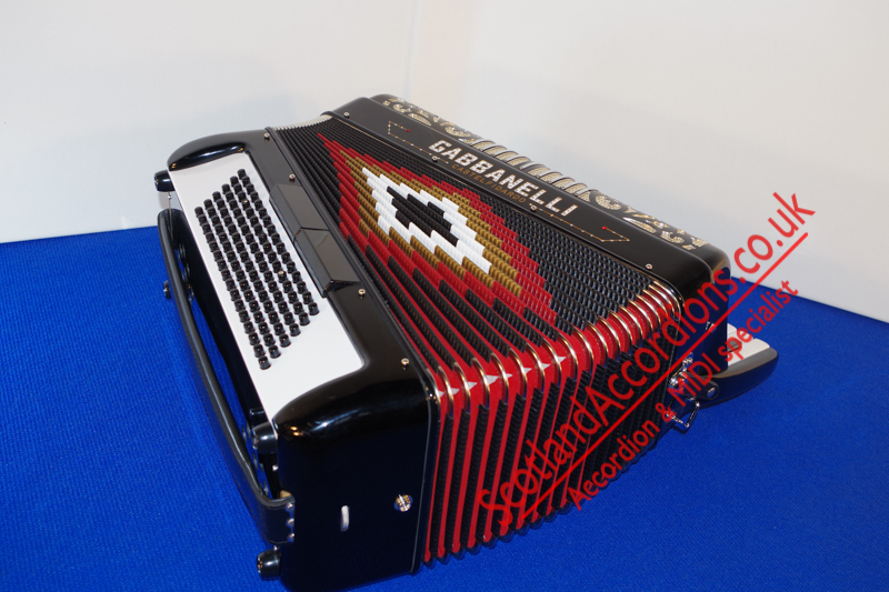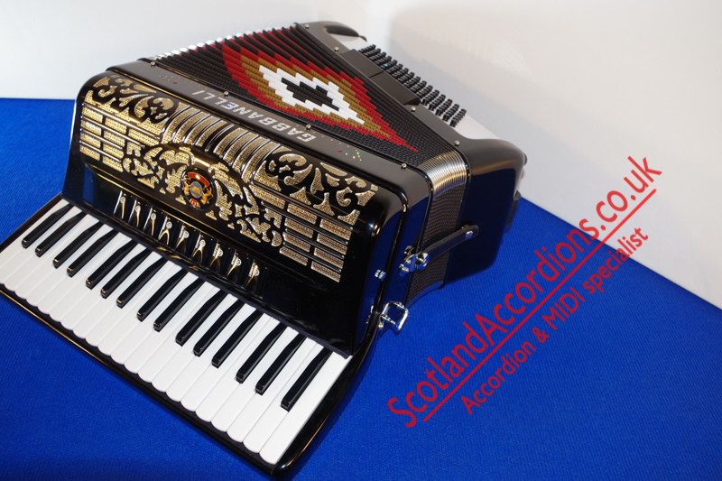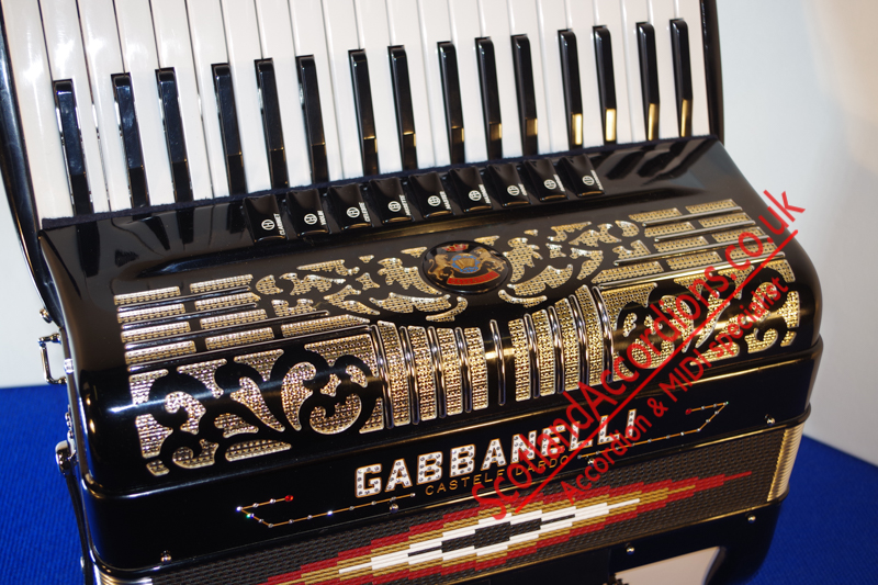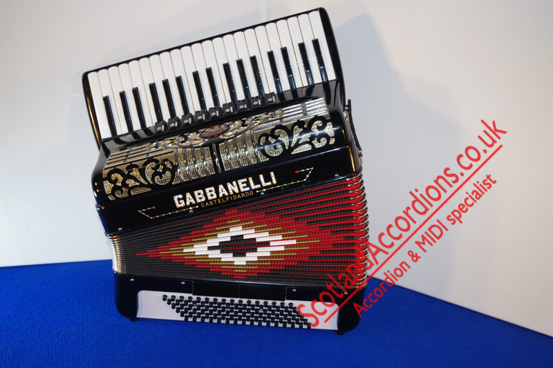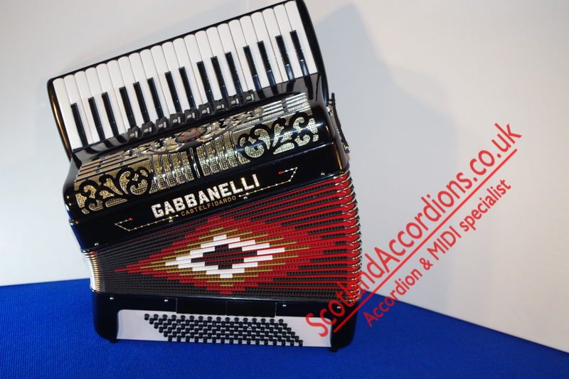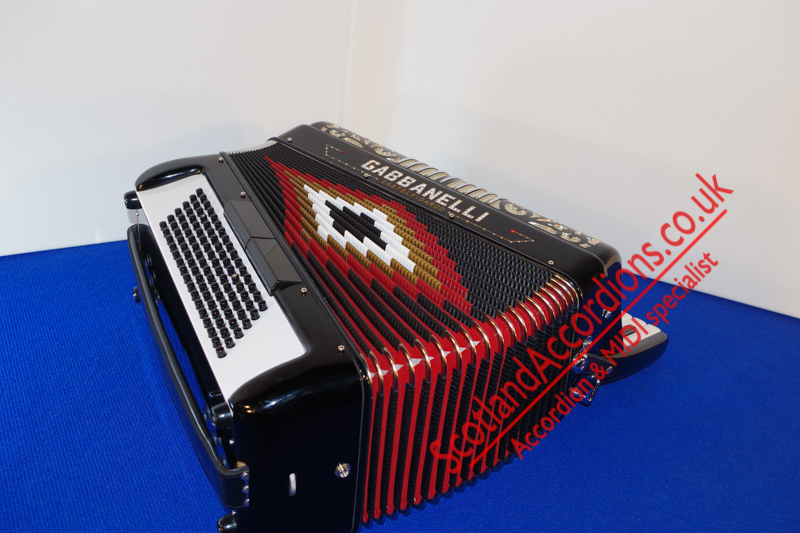 Scotlandaccordions are pleased to present Gabbanelli 37 key 96 bass accordion finished in black with dwcoration and deorated bellows.