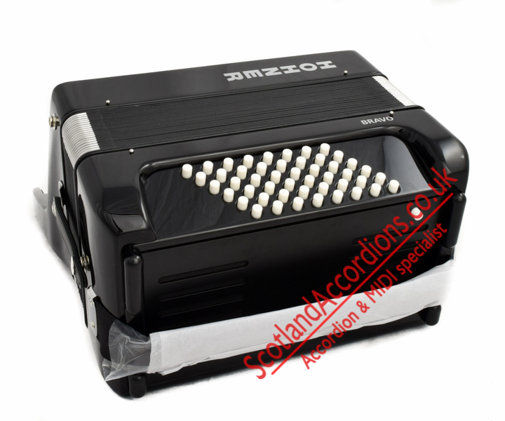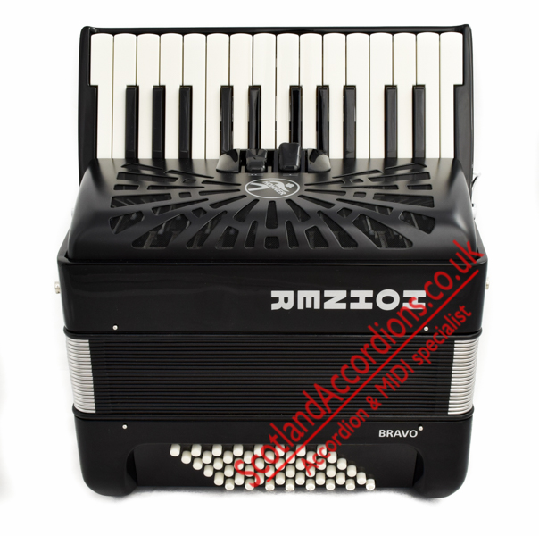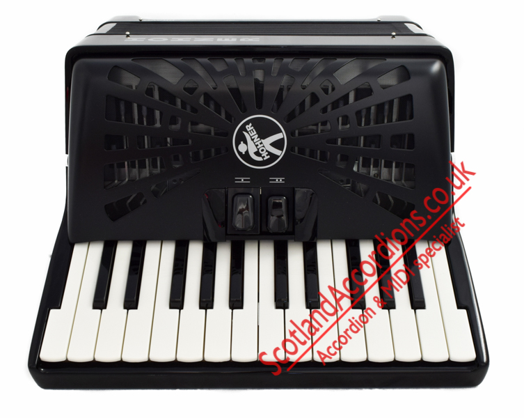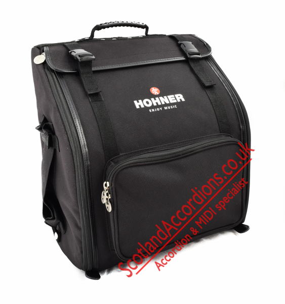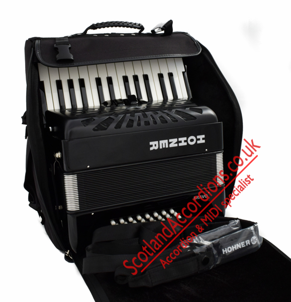 Small very lightweight beginner’s accordion with 48 bass (this format of bass is recommended by teachers).  This model has 4 sets of bass reeds giving a good strong bass and two tremelo tuned sets of reeds in the treble.  Design and quality control by long established Hohner company.