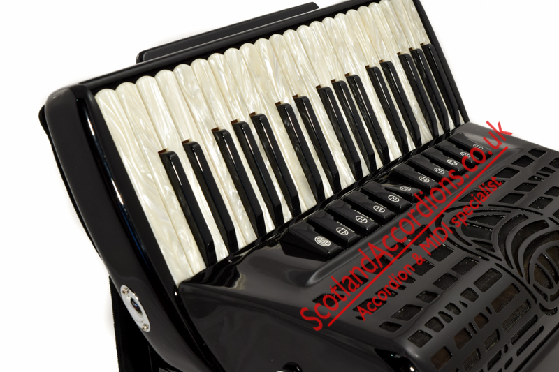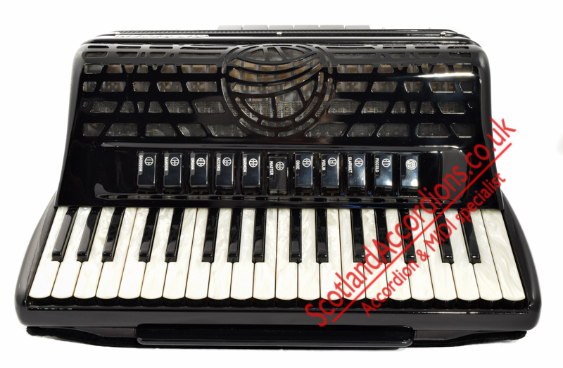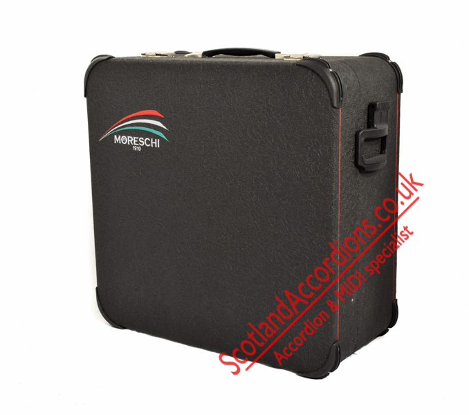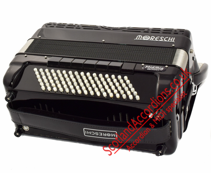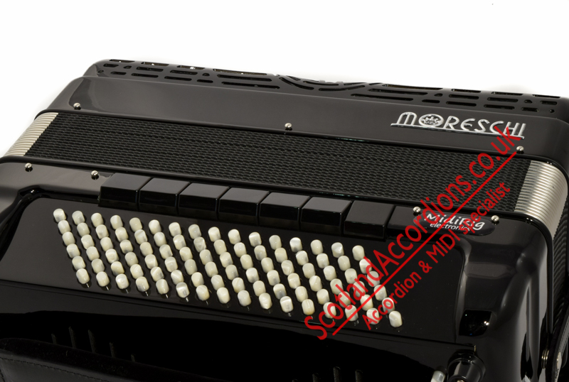 Moreschi is a long established Italian maker of accordions based in Castelfidardo. The Masterpiece IV is made in the popular 37 treble 96 bass format, a size which many people find suitable. This model has hand made reeds giving a superb tone and responsiveness and has an excellent keyboard. It is double octave tuned and has wireless MidiRig MIDI with bellows sensor fitted. Couplers on bass and treble can silence the reeds enabling the accordion to be played with only the electronic sounds – particularly useful when used with headphones for silent practice.