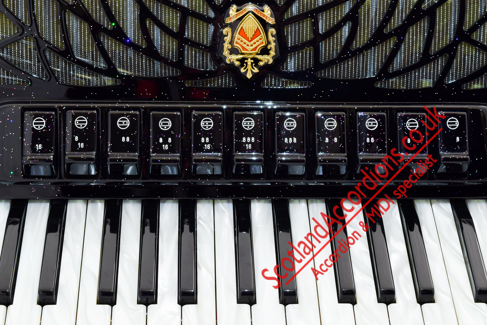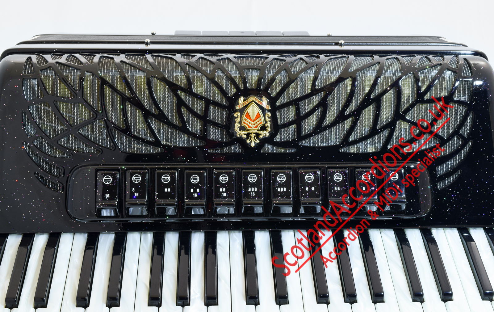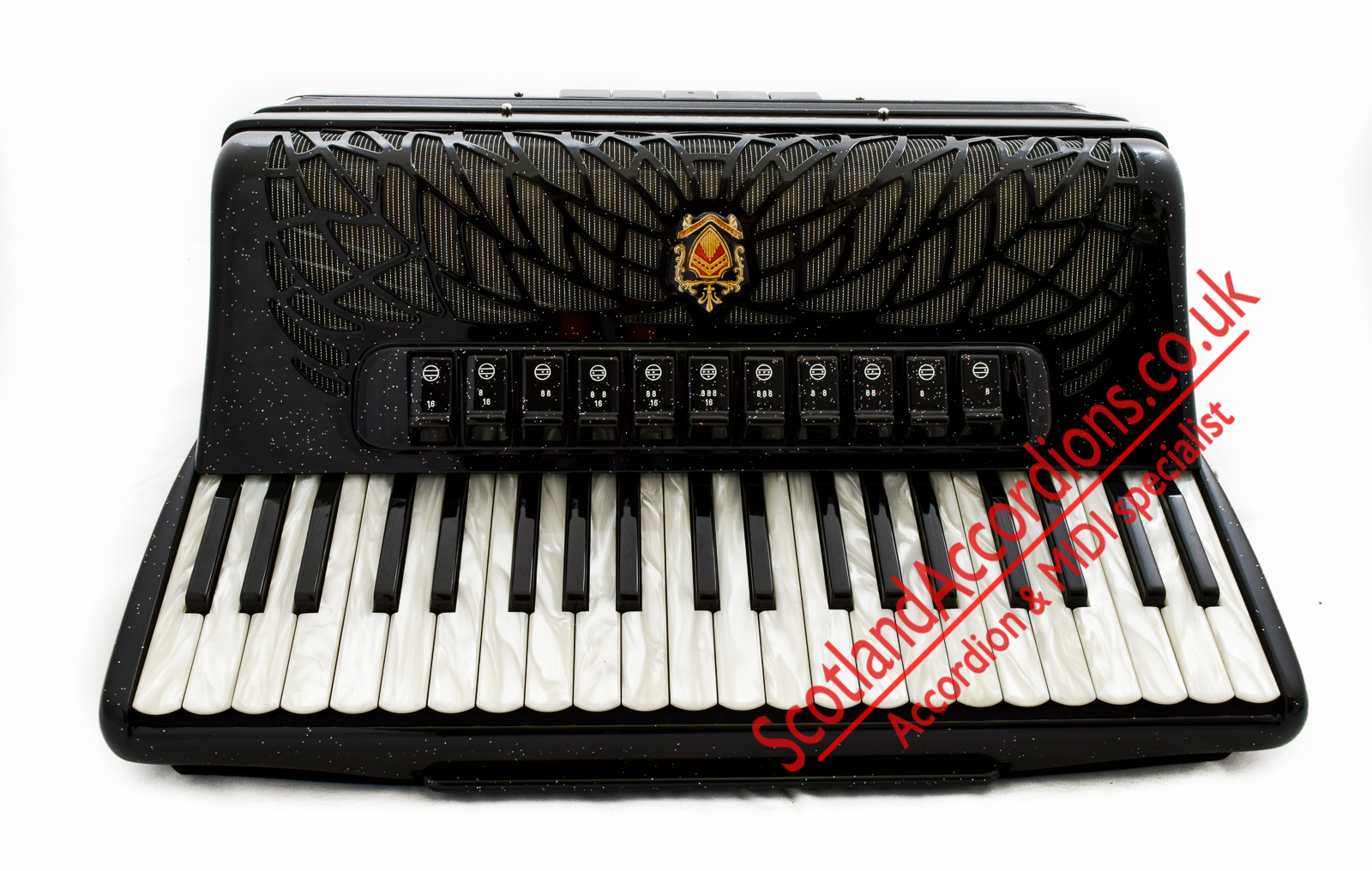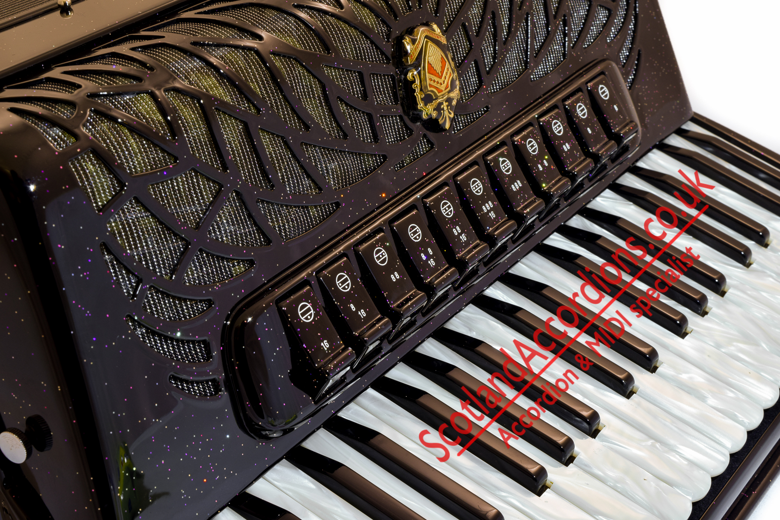 Scandalli Air I S 41 key 120 bass 4 voice black piano accordion with sparkle finish, Scottish musette