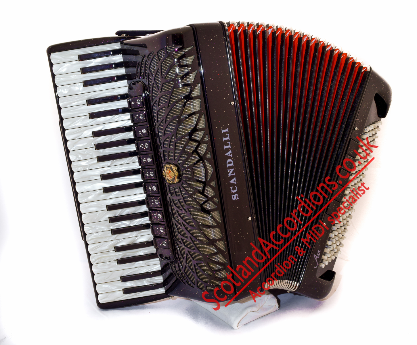 The Scandalli Air I S model is a full size but fairly compact bodied piano accordion with very high build quality and superb sound. This instrument has 41 treble keys and 120 bass and is excellent value for a quality accordion. It is a 4 voice Scottish musette tuned model. This particular instrument has a wider tuned musette than some – this tuning is often favoured when playing in a band – the accordion sound stands out. The sparkle finish gives added stage presence.