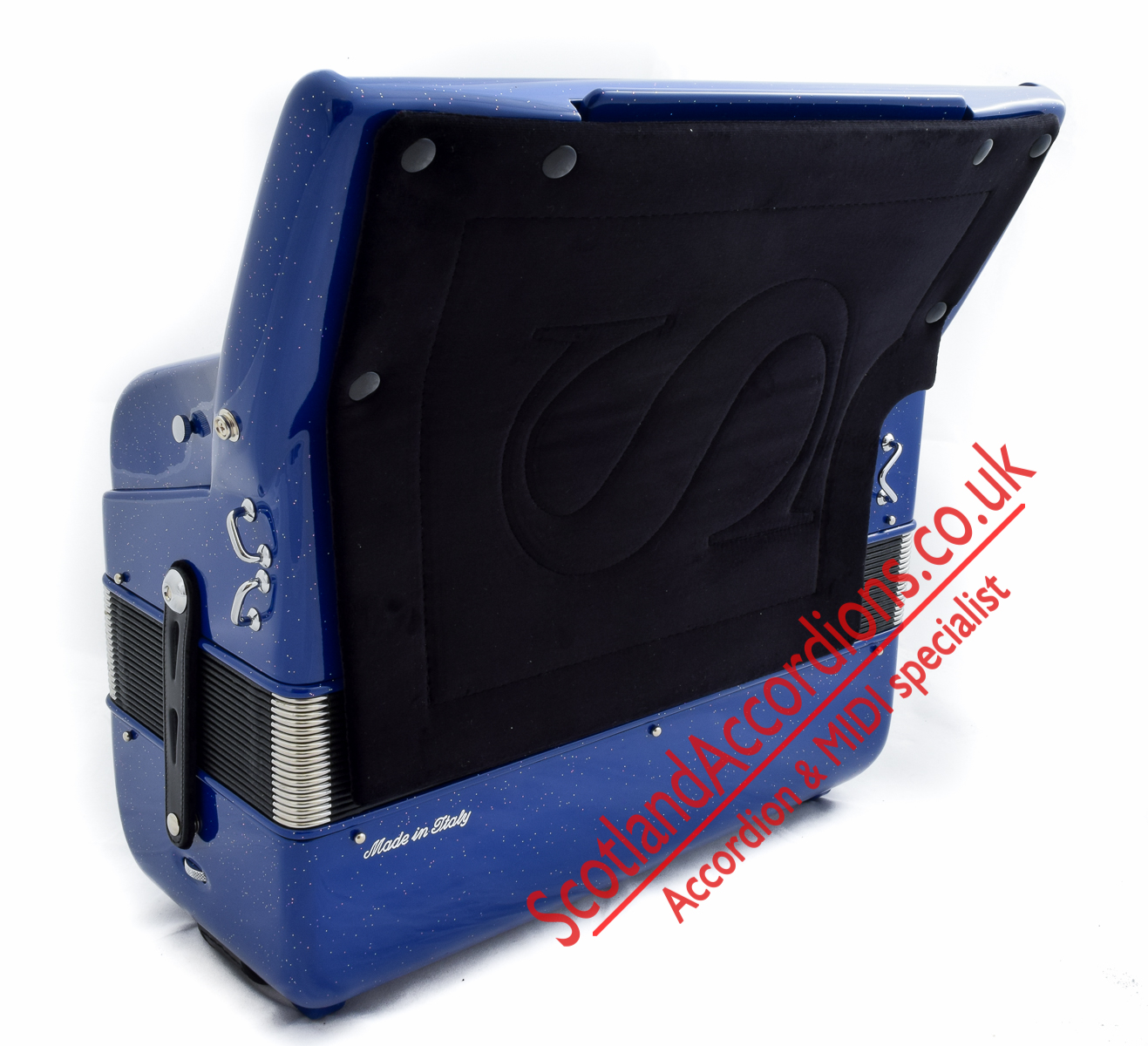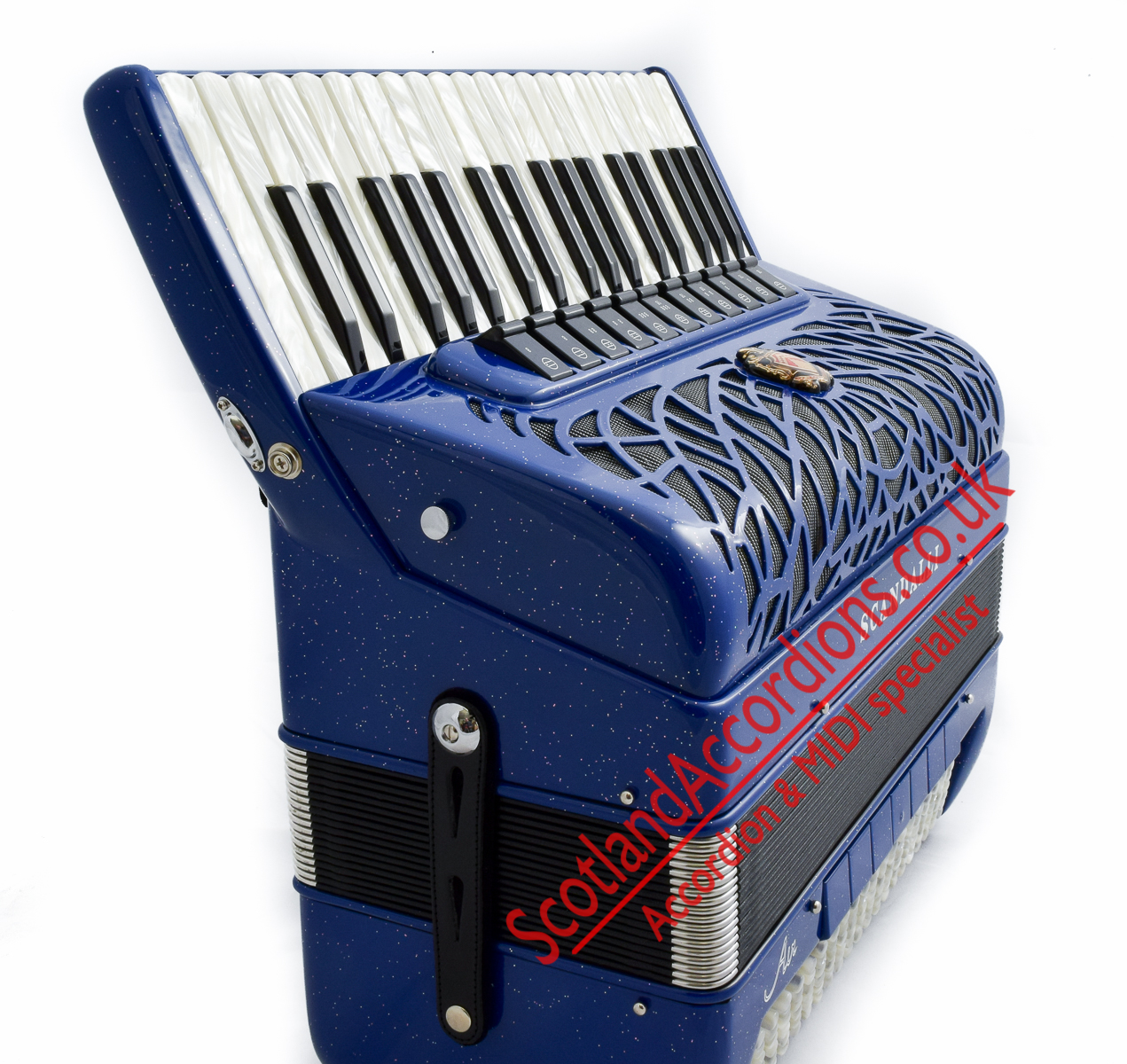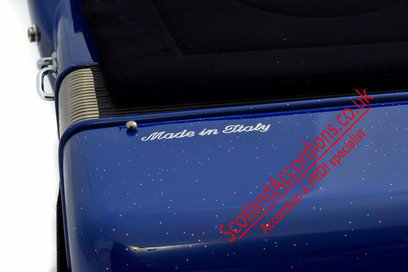 Specially made for us, this unique instrument is the latest design of Air III with double cassotto and hand-made reeds giving a superlative sound. This model has 37 treble keys and 120 bass and is a 4 voice musette tuned instrument. The special blue colour with sparkle finish is particularly striking and attractive.