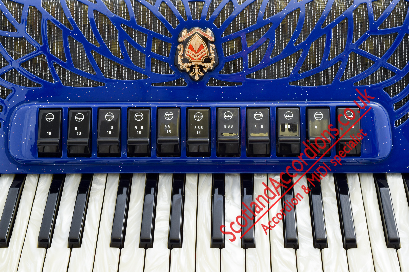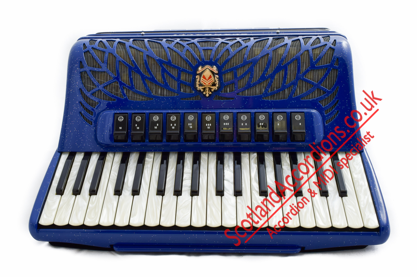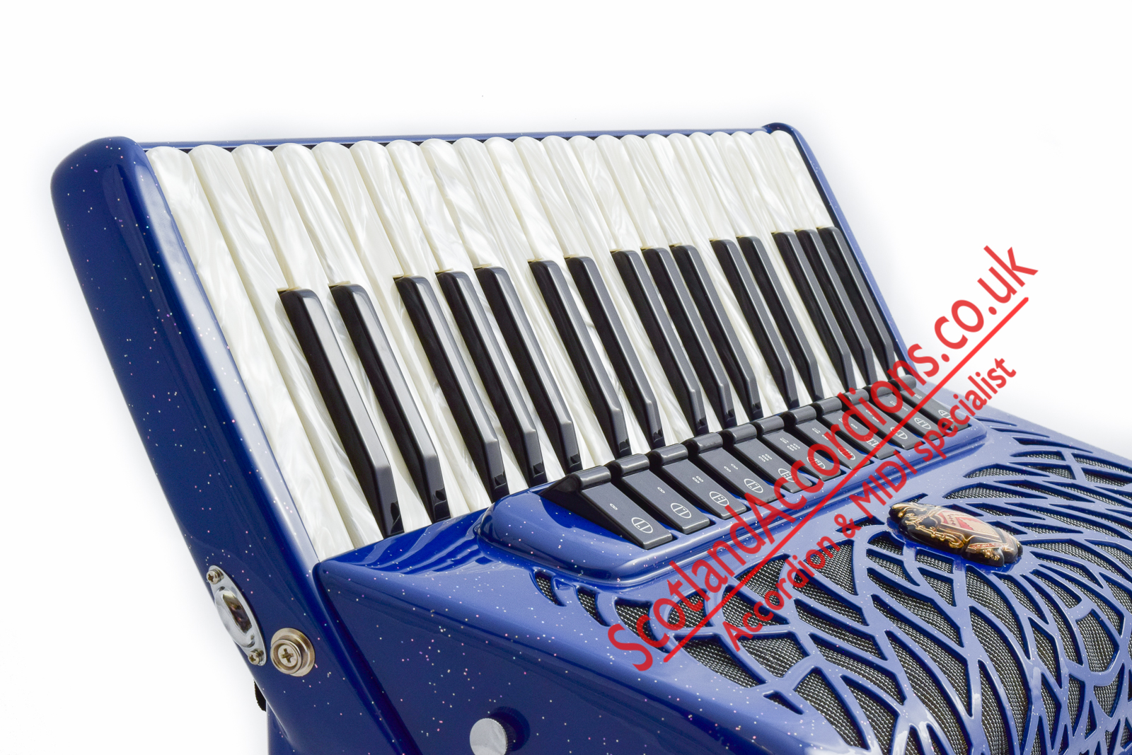 Specially made for us, this unique instrument is the latest design of Air III with double cassotto and hand-made reeds giving a superlative sound. This model has 37 treble keys and 120 bass and is a 4 voice musette tuned instrument. The special blue colour with sparkle finish is particularly striking and attractive.