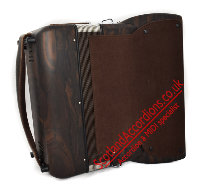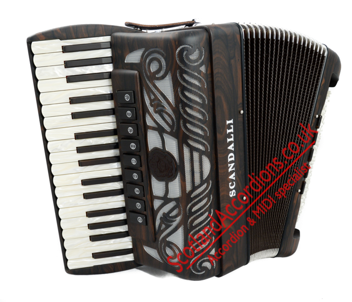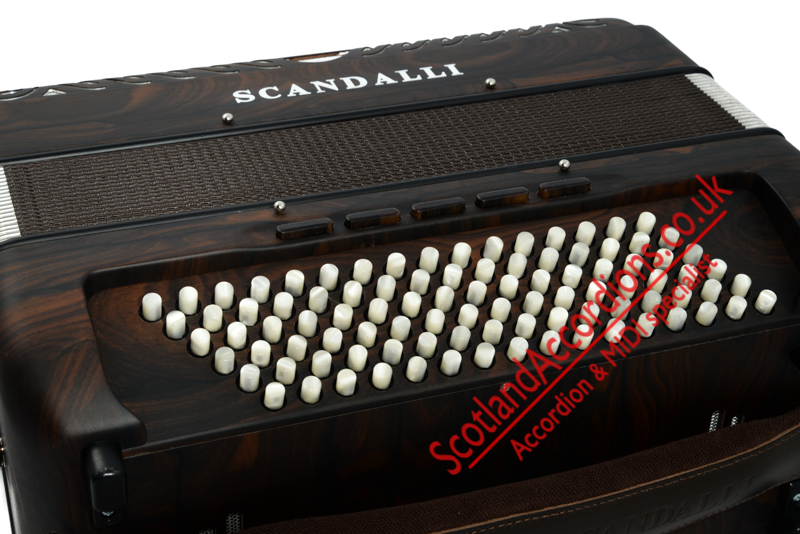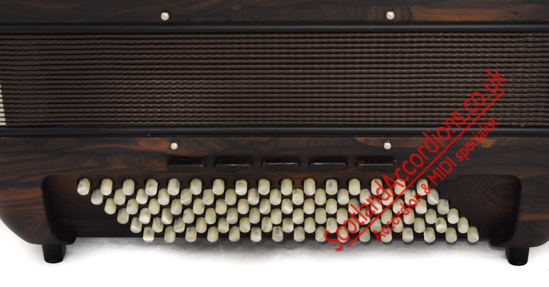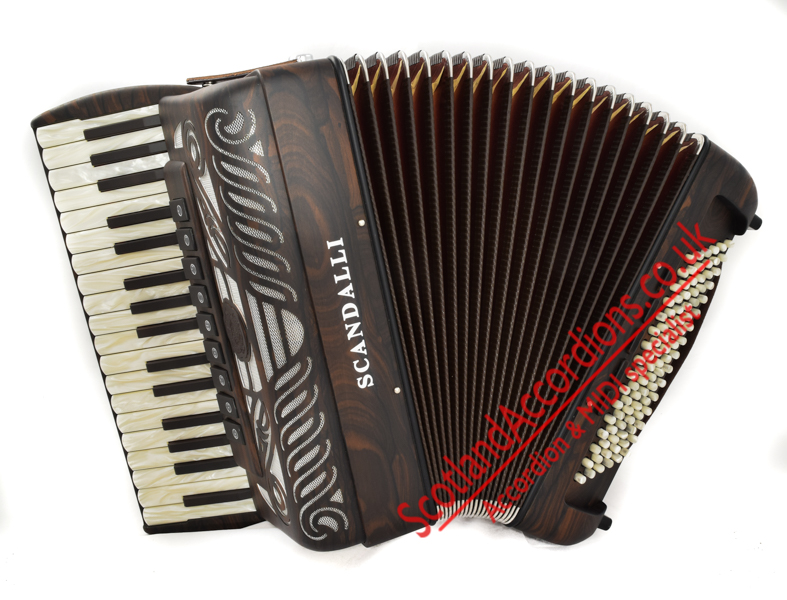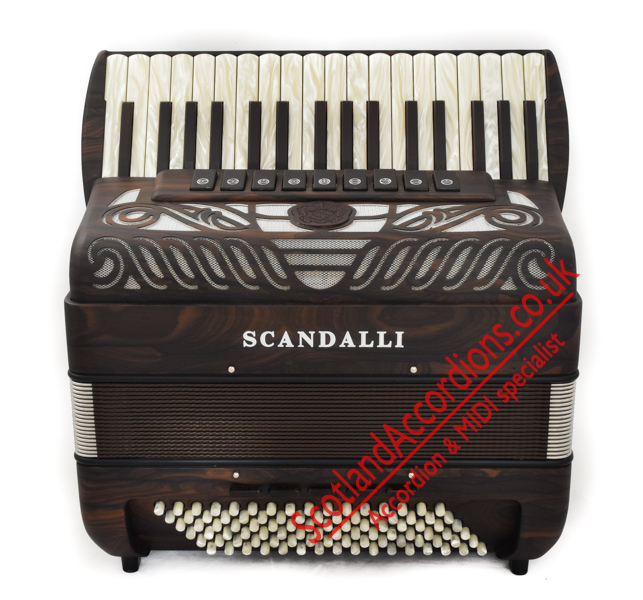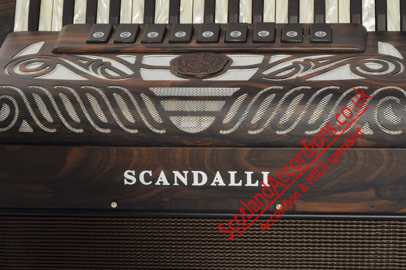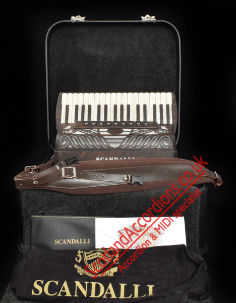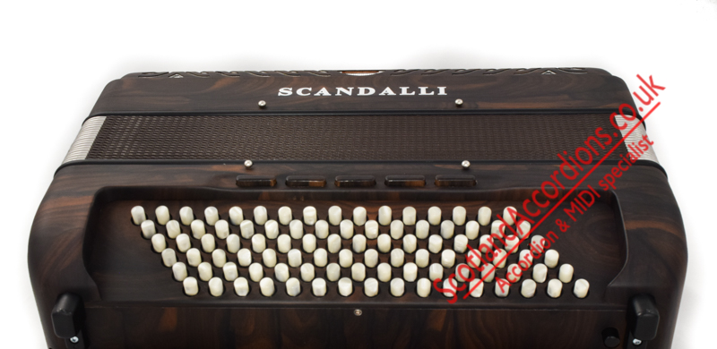 Superb new model, strong sound with 4 sets of treble reeds in a compact instrument. Designed especially for us to our specification, this model has 96 bass but in a 72 bass body size. The extra bass buttons do not add more to the weight than the weight of the buttons themselves. There are 34 treble keys and the whole instrument is compact enough to transport easily while still exhibiting the superb craftsmanship expected from Scandalli accordions. This instrument is finished in ziricote, a stunning dark wood finished to an extremely high standard.