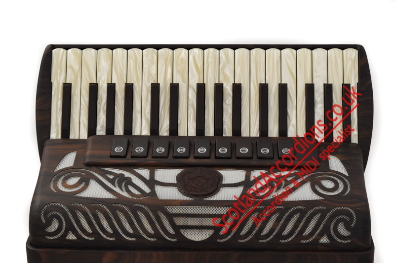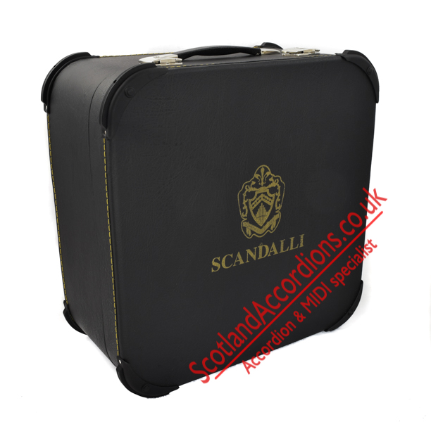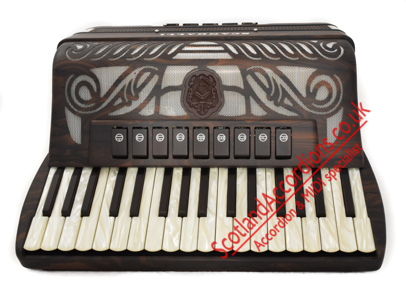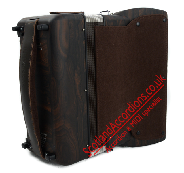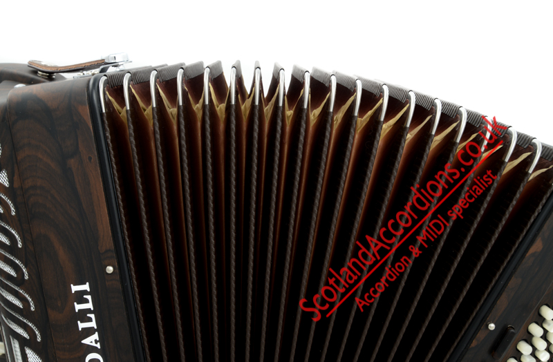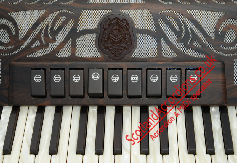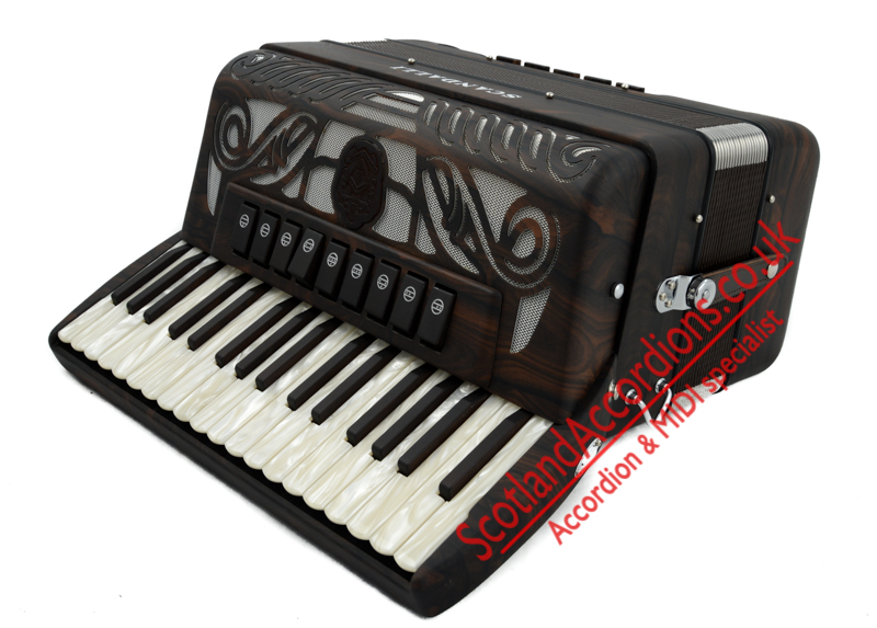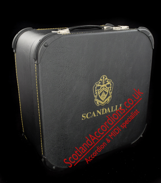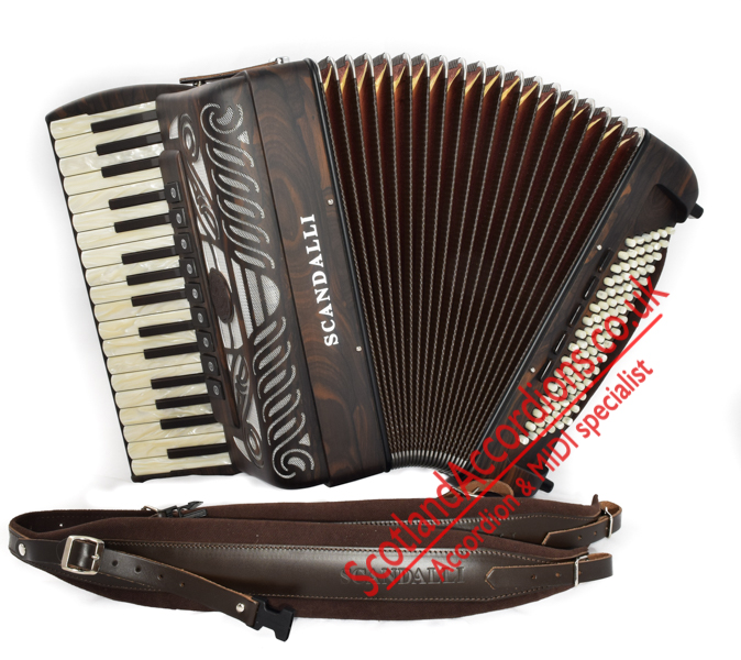 Superb new model, strong sound with 4 sets of treble reeds in a compact instrument. Designed especially for us to our specification, this model has 96 bass but in a 72 bass body size. The extra bass buttons do not add more to the weight than the weight of the buttons themselves. There are 34 treble keys and the whole instrument is compact enough to transport easily while still exhibiting the superb craftsmanship expected from Scandalli accordions. This instrument is finished in ziricote, a stunning dark wood finished to an extremely high standard.