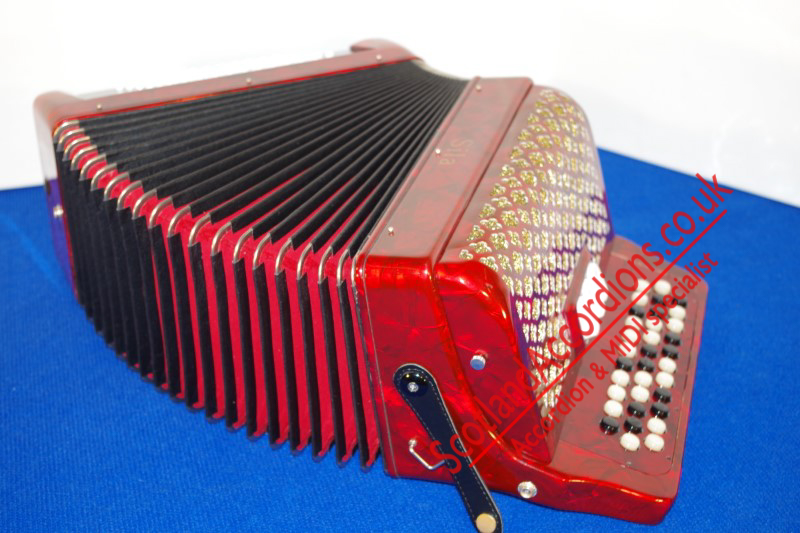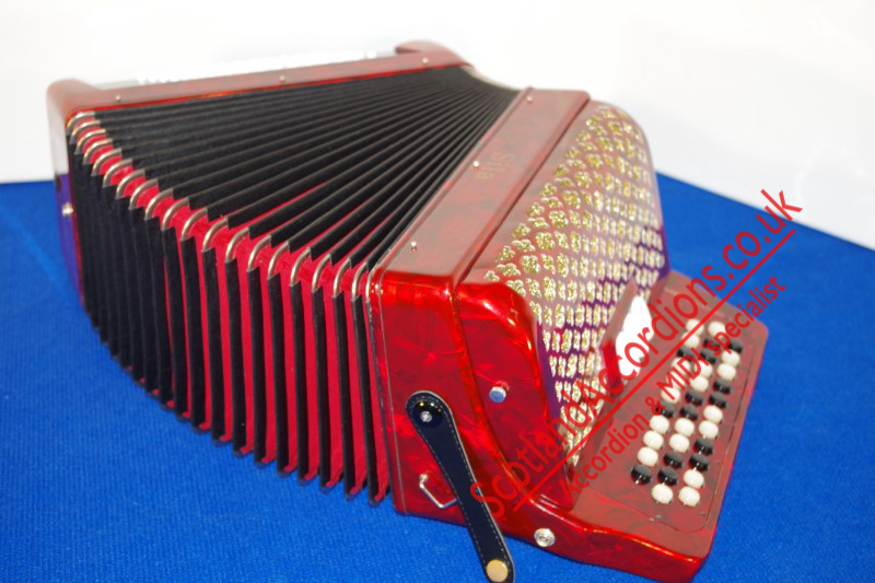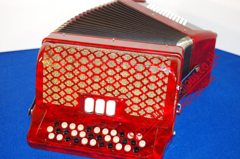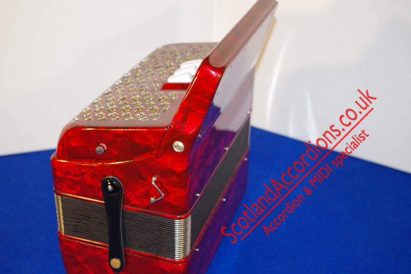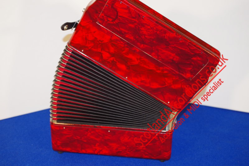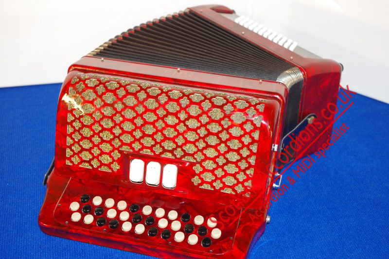 As new accordion finished in red pearloid and gold grille cloth.